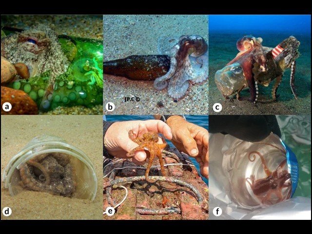 آکٹوپس نے کچرے میں پھینکے گئے ڈبوں اور بوتلوں کو اپنا گھر بنالیا