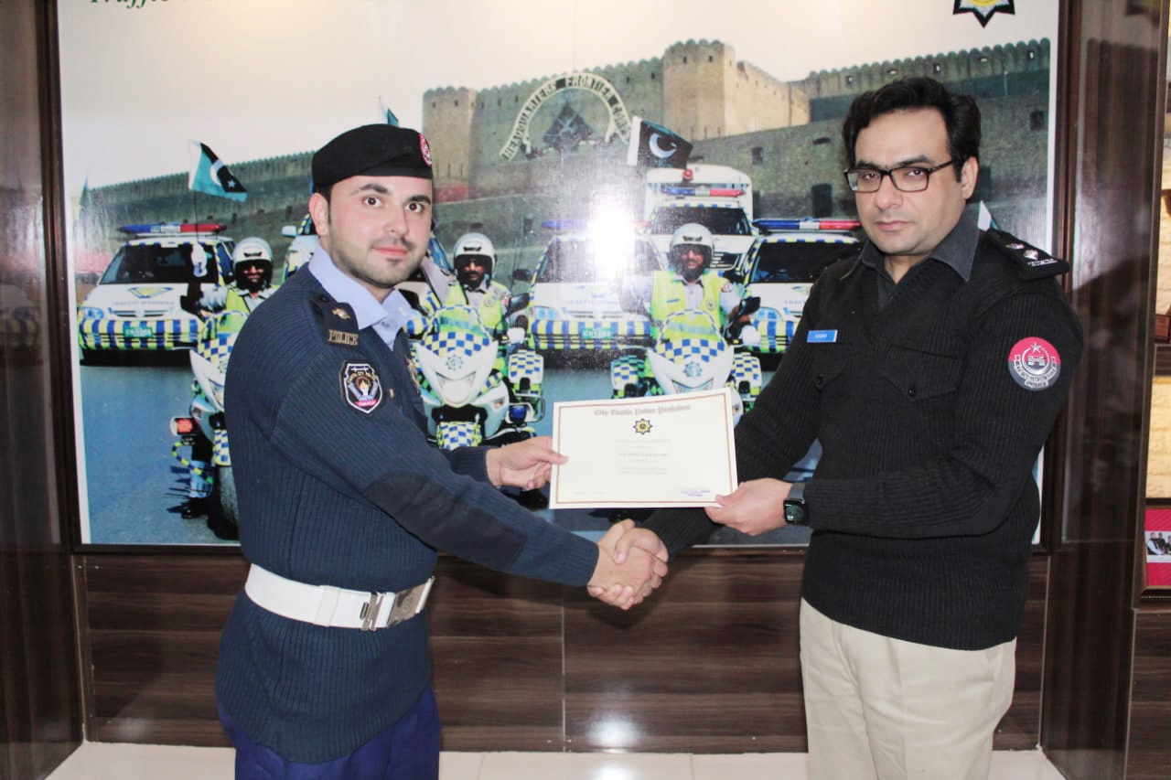 یس ایس پی ٹریفک کاشف ذوالفقار ترجمان ٹریفک پولیس شہاب خان عمر زئی کو بہترین کارکردگی پر سرٹیفیکیٹ دے رہے ہیں